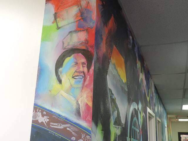A shipping container frame used as a canvas for graffiti art by local artists hangs in the waiting area. Reception desks are outfitted with the ends of shipping container, and the walls in the office corridor pay homage to Malcolm McLean, a North Carolina native known as the “father” of the shipping container.